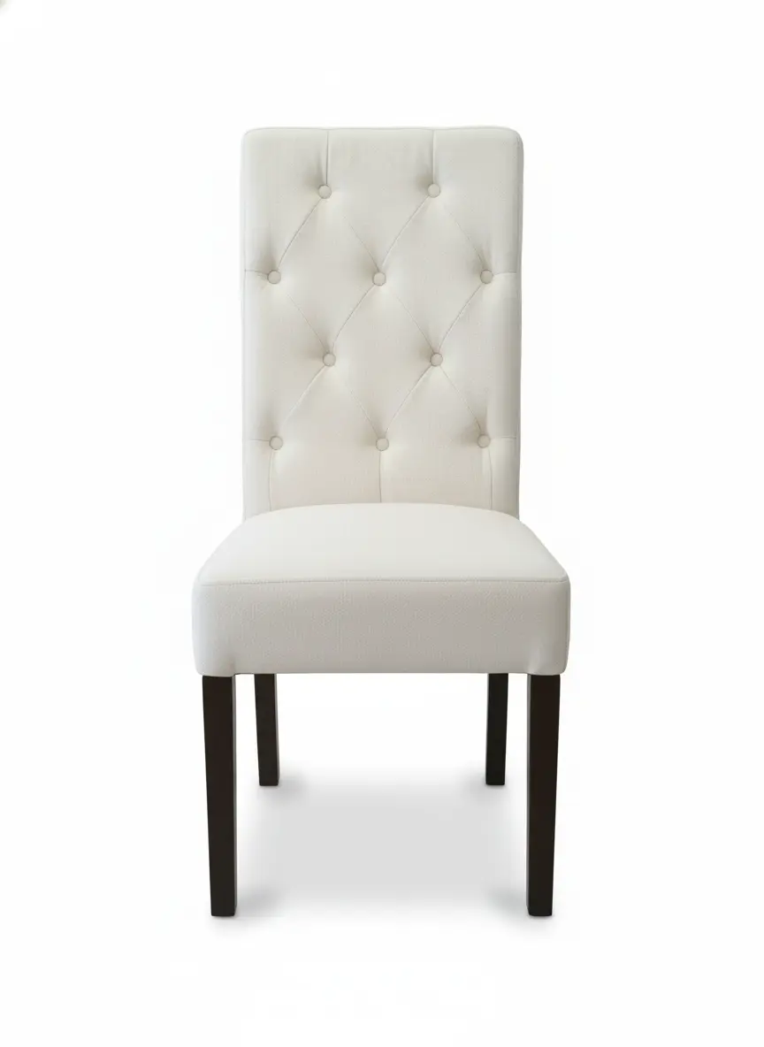 La Silla Esencia es el complemento perfecto de lujo y confort. Tapizada en Blanco Puro, una tela de alta calidad con un sofisticado diseño de capitoné en el respaldo, esta silla irradia elegancia atemporal. Su estructura se apoya sobre robustas patas de Madera de Cedro, que aportan un tono cálido y distinguido, garantizando un soporte firme y una durabilidad excepcional para sus largas sobremesas.